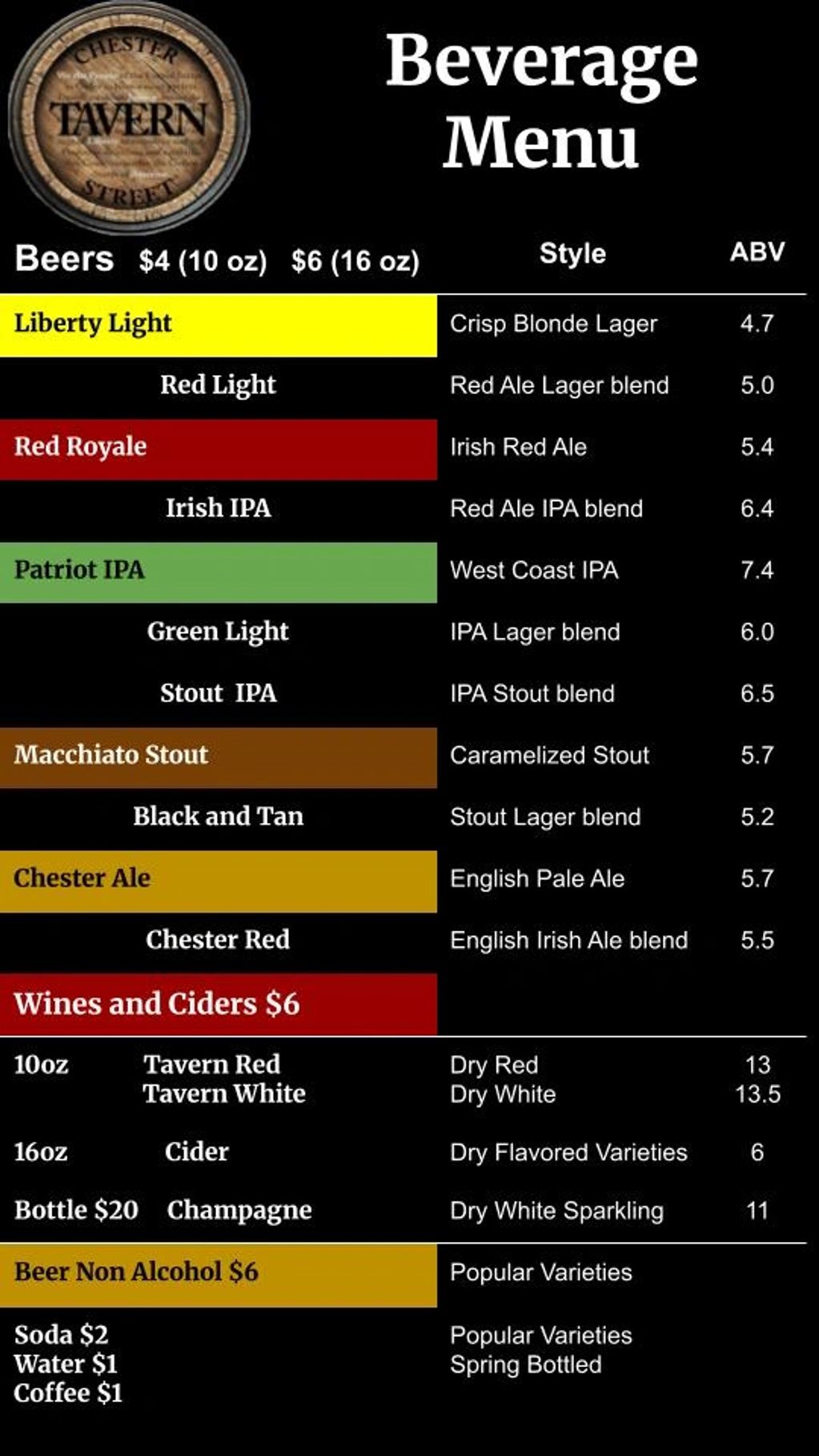 Tavern beverages includes a variety of craft beers, wines, and ciders.